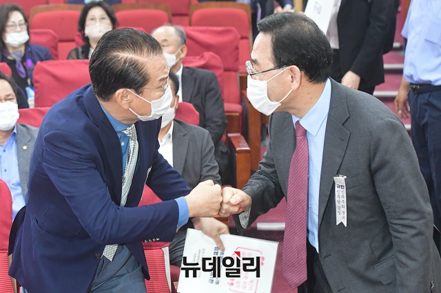 주호영 미래통합당 원내대표와 권영세 의원이 6일 오후 국회 의원회관에서 열린 '제2의 정의연 방지를 위한 국민감독위원회 설치 토론회'에 앞서 인사를 하고 있다.