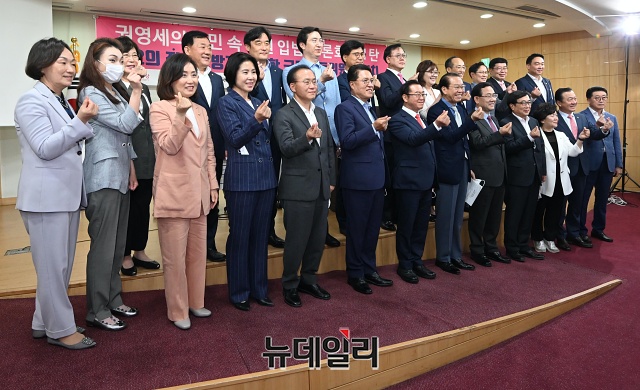 주호영 미래통합당 원내대표, 이종배 정책위의장, 권영세 의원을 비롯한 참석자들이 6일 오후 국회 의원회관에서 열린 '제2의 정의연 방지를 위한 국민감독위원회 설치 토론회'에서 기념촬영을 하고 있다.