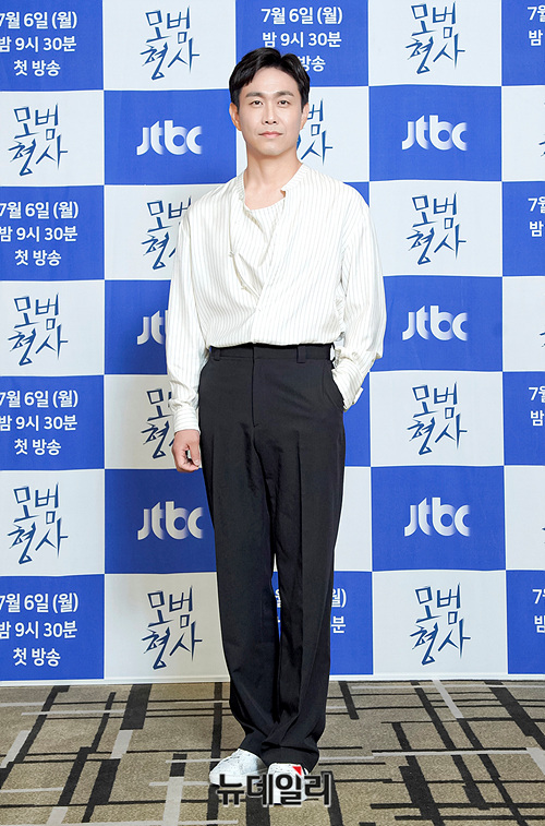 배우 오정세가 6일 오후 온라인으로 진행된 JTBC 새 월화드라마 '모범형사' 제작발표회에서 포토타임을 갖고 있다.