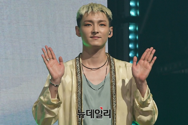 아이돌그룹 SF9(에스에프나인) 멤버 주호가 6일 오후 서울 광진구 예스24 라이브홀에서 열린 미니 8집 '9loryUS(글로리어스)' 쇼케이스에서 포토타임을 갖고 있다.