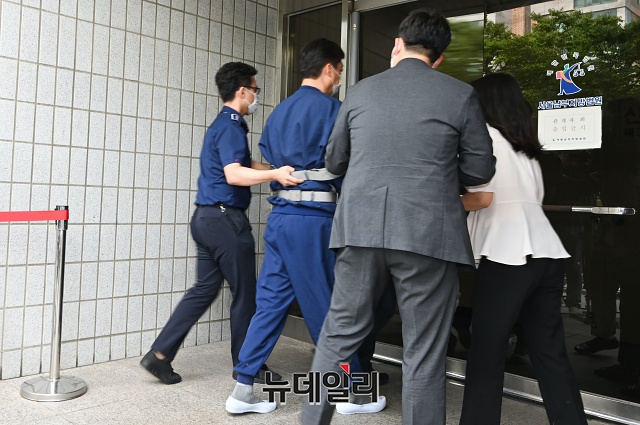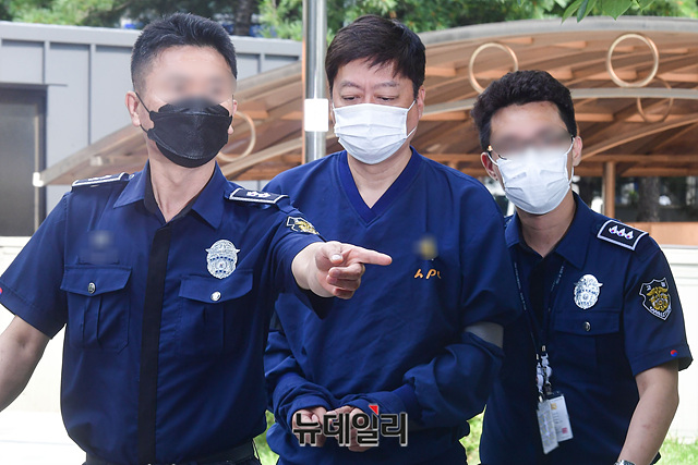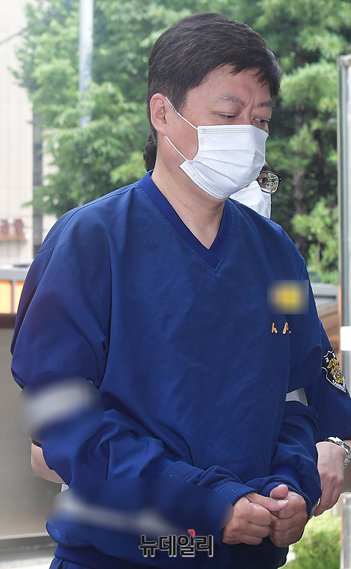 코스닥 상장사 '리드'의 실사주 김정수 회장이 8일 오전 서울 양천구 서울남부지방법원에서 열린 피의자 심문(영장실질심사)에 출석하고 있다.