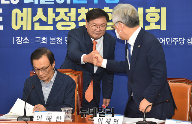 김태년 더불어민주당 원내대표, 이재명 경기도지사가 8일 오전 국회에서 열린 '더불어민주당-경기도 예산정책협의회'에 참석해 인사를 나누고 있다.