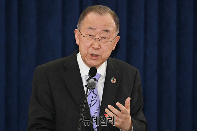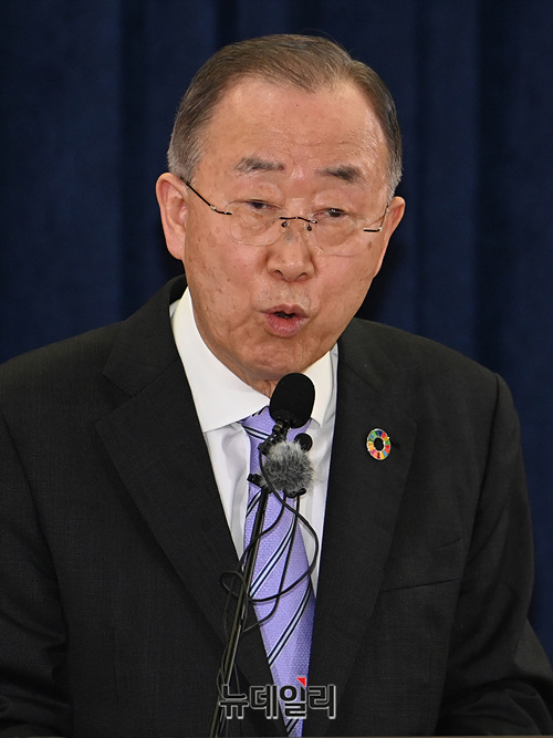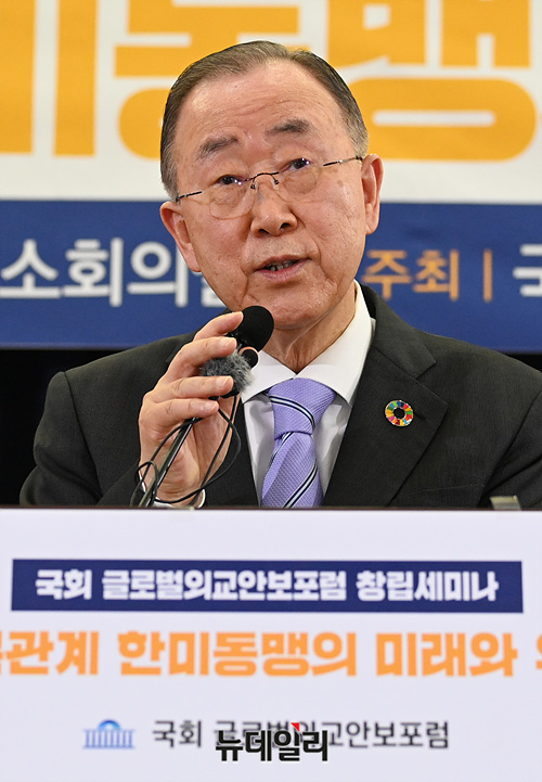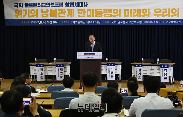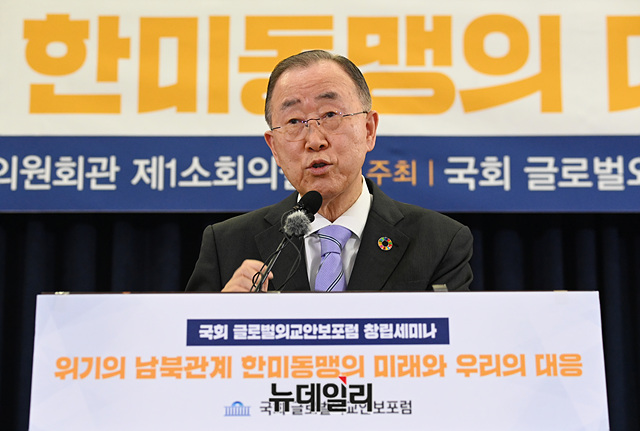 반기문 전 유엔사무총장이 8일 오전 국회 의원회관에서 열린 국회 글로벌외교안보포럼 창립세미나 '위기의 남북관계 한미동맹의 미래와 우리의 대응'에 참석해 기조연설을 하고 있다.