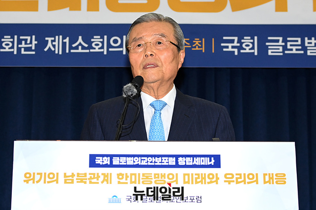 김종인 미래통합당 비상대책위원장이 8일 오전 국회 의원회관에서 열린 국회 글로벌외교안보포럼 창립세미나 '위기의 남북관계 한미동맹의 미래와 우리의 대응'에 참석해 기조연설을 하고 있다.