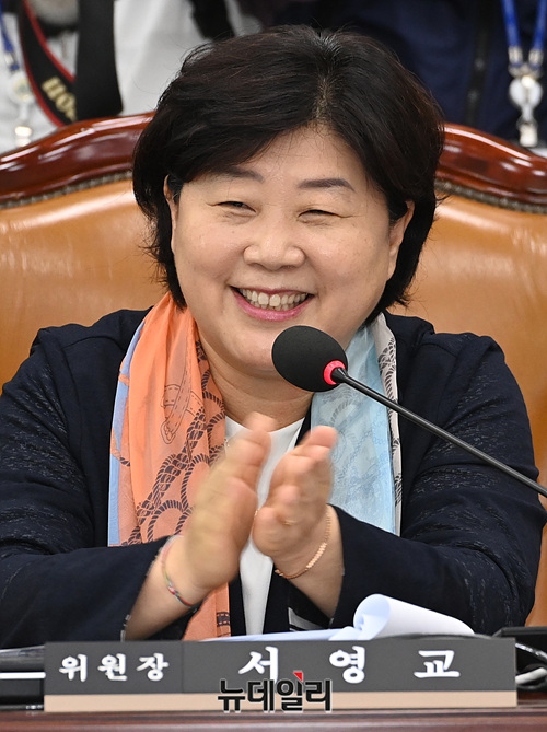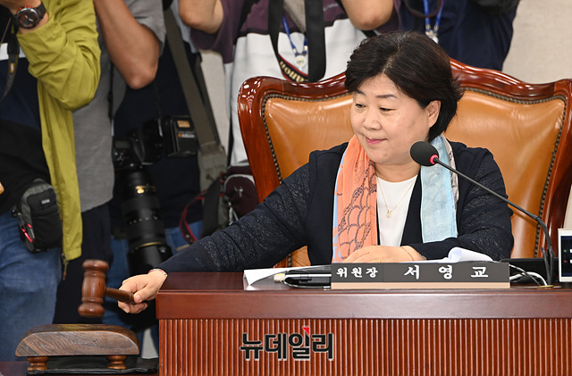 서영교 국회 행정안전위원장이 8일 오후 국회에서 열린 행안위 전체회의에서 의사봉을 두드리고 있다.