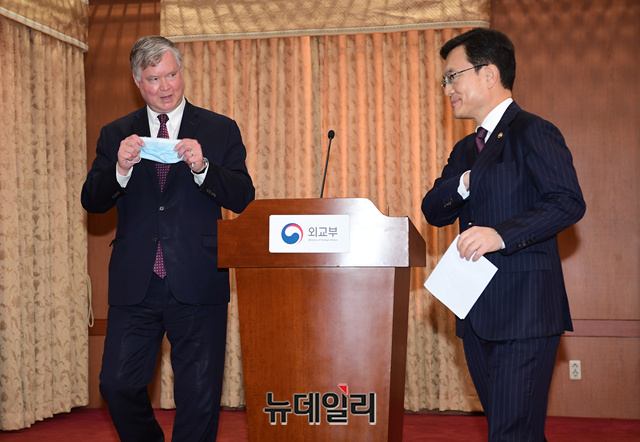 스티븐 비건 미국 국무부 부장관 겸 대북특별대표와 조세영 외교부 1차관이 8일 오전 서울 외교부 청사에서 제8차 한미 외교차관 전략회의를 마친 뒤 기자회견을 하고 있다. (사진=공동취재단)