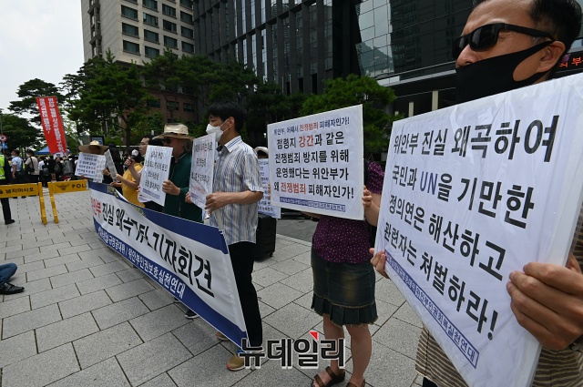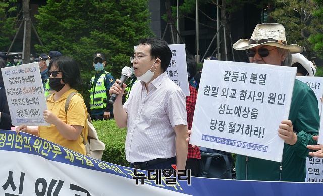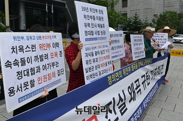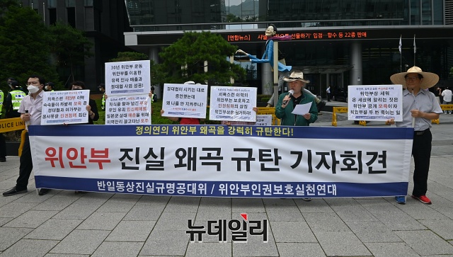 반일동상진실규명공대위가 8일 오후 서울 종로구 위안부소녀상 인근에서 '위안부 진실 왜곡 규탄 기자회견'을 열고 있다.