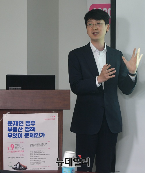 김성환 건설산업연구원 박사가 9일 오전 국회 의원회관에서 열린 '문재인 정부 부동산정책 무엇이 문제인가' 토론회에서 '문재인 정부의 주요 부동산 정책'을 주제로 발제하고 있다.