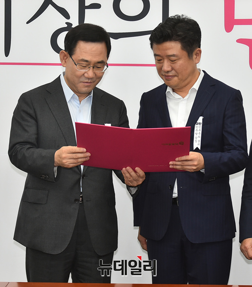 주호영 미래통합당 원내대표가 9일 오전 국회에서 열린 '사모펀드 비리방지 및 피해구제 특별위원회 1차 회의'에서 유의동 위원장에게 임명장을 수여하고 있다.