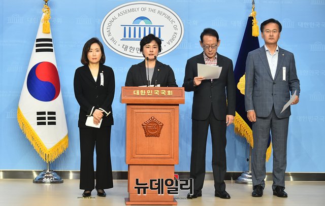 미래통합당 국회 법제사법위원회 소속 전주혜, 조수진, 김도읍, 유상범 의원이 9일 오후 국회 소통관에서 최강욱 열린민주당 대표의 법무부 입장문 가안 유출 의혹 관련 기자회견을 갖고 있다.
