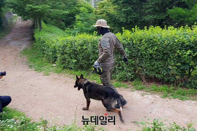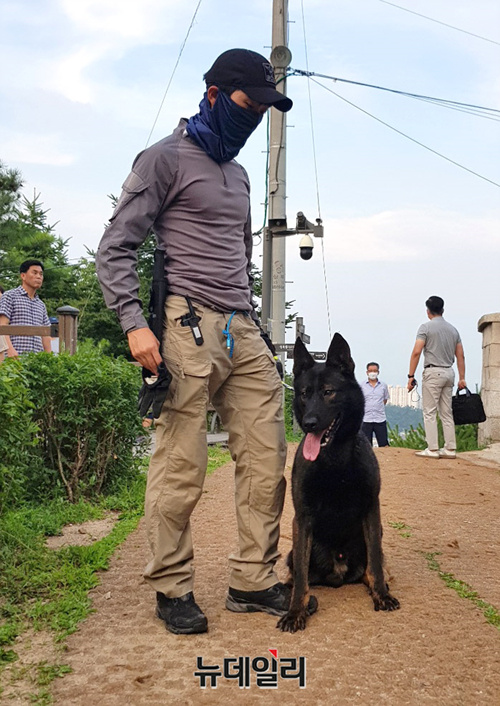 경찰이 9일 연락이 두절돼 실종신고가 된 박원순 서울시장의 행방을 찾기 위해 서울 종로구 소재 공원 인근에서 수색견으로 수색작업을 벌이고 있다. 박 시장의 휴대전화 최종 기지국이 서울 성북구로 확인돼 경찰은 소재 파악에 나선 상태다.
