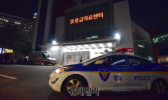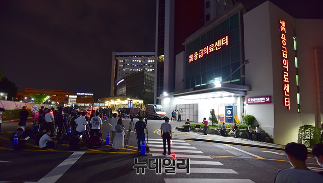 연락이 두절된 박원순 서울시장을 기다리는 취재진과 일부 시민들이 9일 오후 서울 종로구 서울대학교병원 응급의료센터 앞을 지키고 있다. 경찰과 소방당국은 1차수색 결과를 발표하고, 오후 10시 30분부터 2차 야간 수색에 돌입한다고 밝혔다.