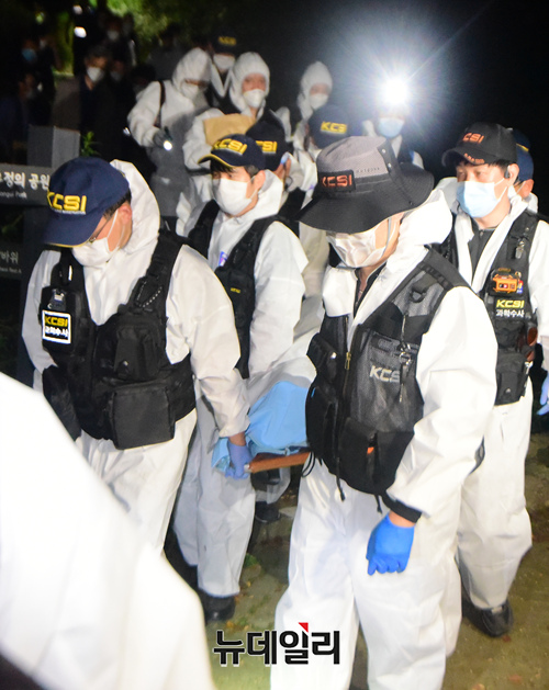 경찰과학수사대원들이 10일 오전 서울 종로구 숙정문 인근에서 숨진 채 발견된 박원순 서울시장의 시신을 운구해서 산을 내려 오고 있다. 박 시장은 지난 9일 오후 5시 17분께 연락두절 상태라는 신고가 경찰에 접수됐다.
