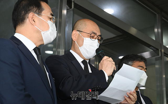 서울시 관계자들이 10일 오전 서울 종로구 서울대학교병원 장례식장 앞에서 故 박원순 서울시장의 유언장을 공개하고 있다.