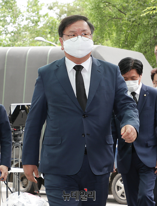 김태년 더불어민주당 원내대표가 10일 오후 서울 종로구 서울대학교병원 장례식장에 마련된 故 박원순 서울시장의 빈소를 조문한 뒤 장례식장을 나서고 있다. 고인의 장례는 사상 처음으로 5일간 서울특별시 장으로 치러진다.