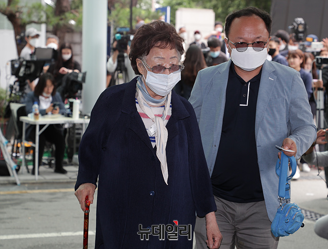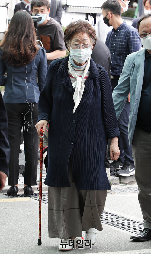 이용수 할머니가 10일 오후 서울 종로구 서울대학교병원 장례식장에 마련된 故 박원순 서울시장의 빈소를 조문한 뒤 취재진의 질문에 답하고 있다. 고인의 장례는 사상 처음으로 5일간 서울특별시 장으로 치러진다.