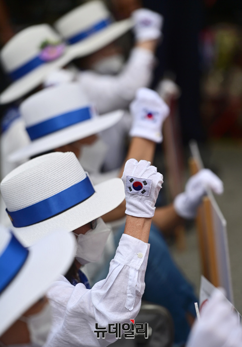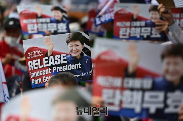 조원진 우리공화당 대표를 비롯한 지도부가 박근혜 전 대통령의 파기환송심 선고 공판이 열린 10일 오후 서울 서초구 서울고등법원 앞에서 박 전 대통령의 무죄석방을 주장하고 있다.