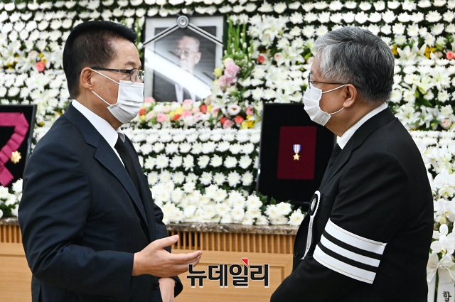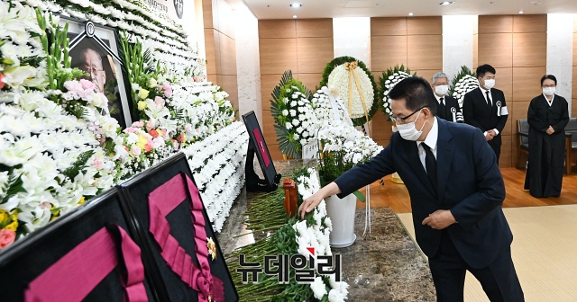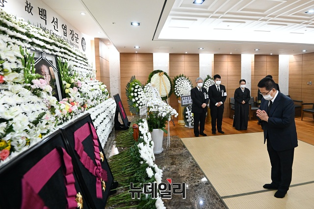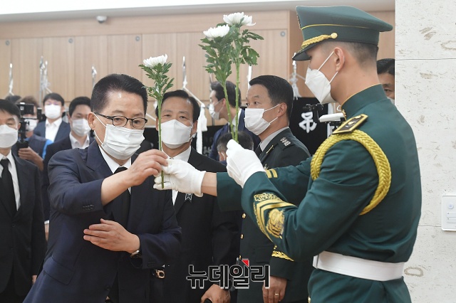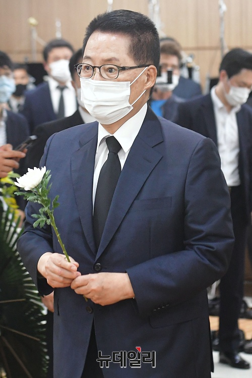 박지원 국정원장 내정자가 11일 오후 서울 송파구 서울아산병원 장례식장에 마련된 故 백선엽 장군의 빈소를 찾아 헌화하고 있다.