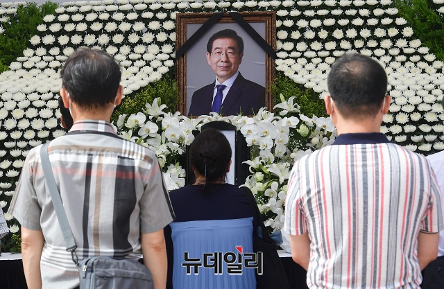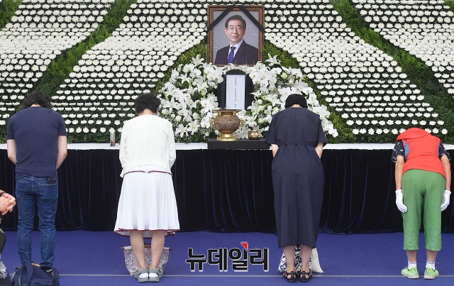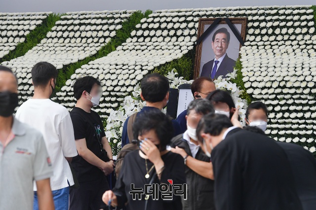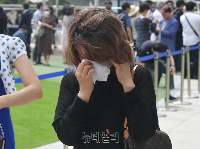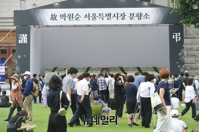 시민분향소를 찾은 한 시민이 11일 오후 서울 중구 서울시청 앞에 마련된 故 박원순 서울시장의 조문을 마치고 눈물을 훔치고 있다. 시민분향소는 13일까지 운영한다. 시간은 오전 8시부터 오후 10시까지다.