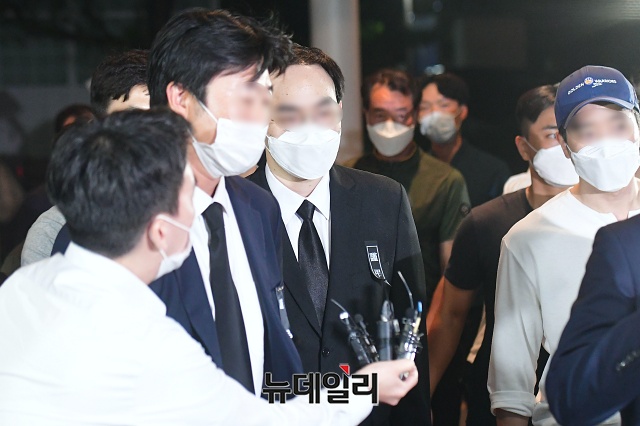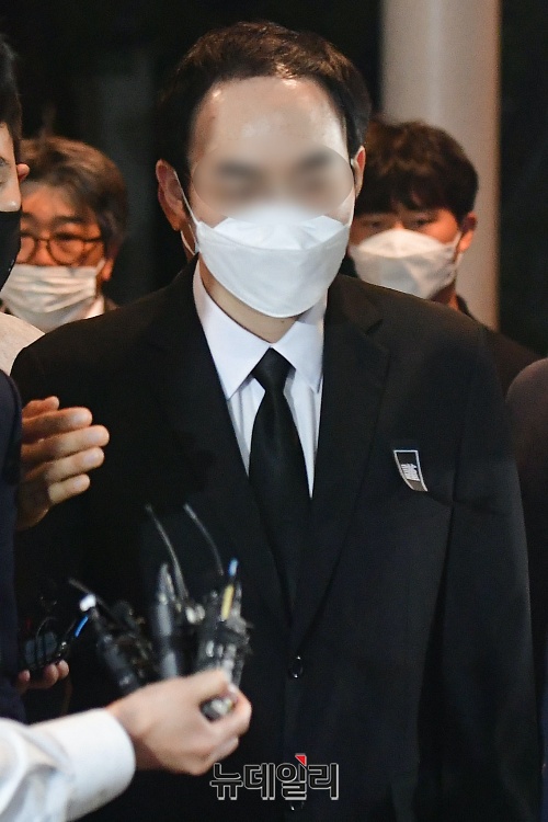 박원순 서울시장의 아들 주신 씨가 11일 오후 서울 종로구 서울대학교 장례식장에 마련된 아버지의 빈소에 경호를 받으며 입장하고 있다.