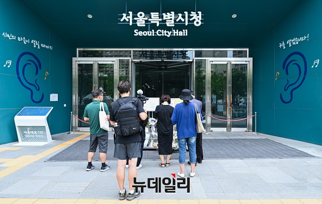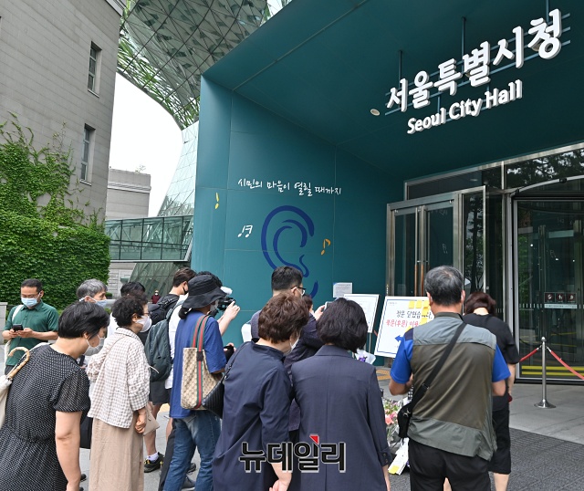 시민분향소를 찾은 시민들이 12일 오후 서울 중구 서울시청 정문 앞에 붙여진 故 박원순 서울시장의 추모 메모들을 보고있다.