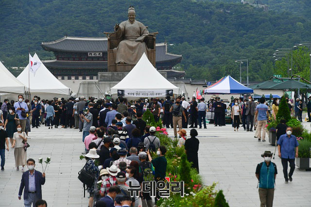 백선엽 장군 시민분향소를 찾은 시민들이 12일 오후 서울 종로구 광화문 광장에 마련된 빈소 조문을 위해 줄을 서 있다. 나라지킴이운동본부는 이날 광화문 광장 앞에 '백선엽 장군 국민장 시민 분향소'를 열고 시민들의 조문을 받았다.