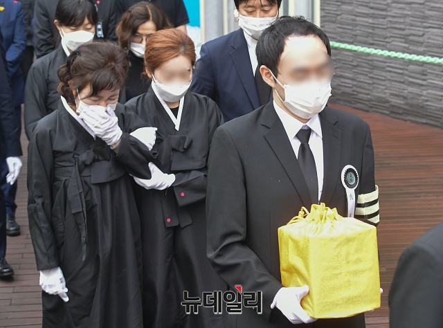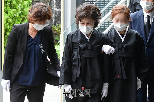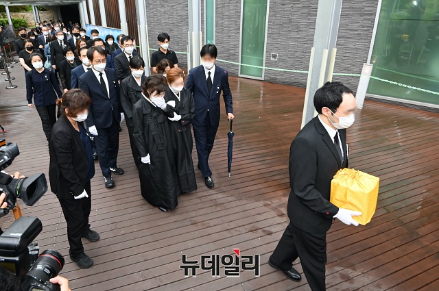 강난희 여사를 비롯한 박원순 서울시장 유족들이 13일 오후 서울 서초구 서울추모공원에서 유골함을 들고 이동하고 있다. 고인의 유골은 고향인 경남 창녕으로 옮겨질 예정이다.