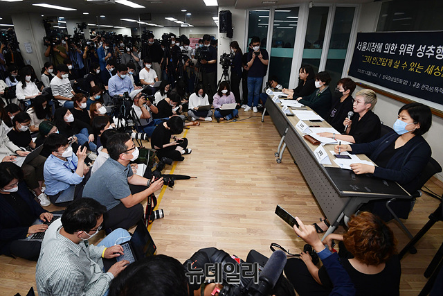 故 박원순 서울시장을 성추행 혐의 등으로 고소한 피해여성을 대리하는 김재련 변호사가 13일 오후 서울 은평구 한국여성의전화 사무실에서 열린 '서울시장에 의한 위력 성추행 사건 기자회견'에서 발언을 하고 있다.