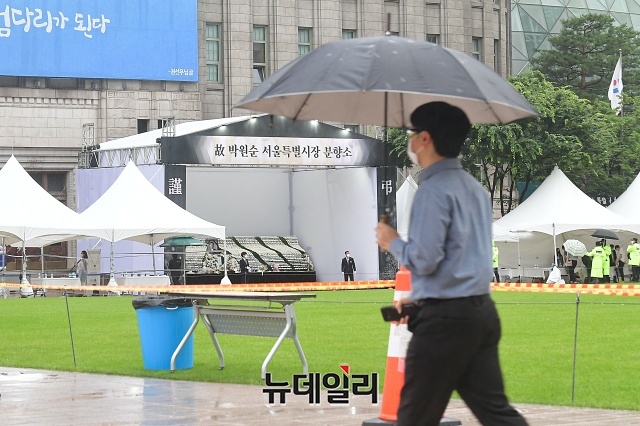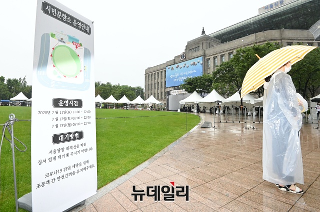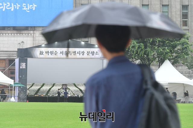 박원순 시민분향소를 찾은 시민들이 13일 오후 서울 중구 서울시청 앞에 마련된 분향소를 바라보고 있다. 시민분향소는 오늘 밤 10시까지 운영한다.
