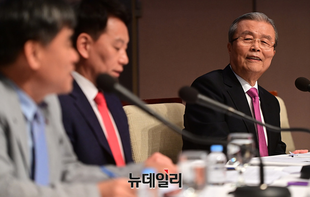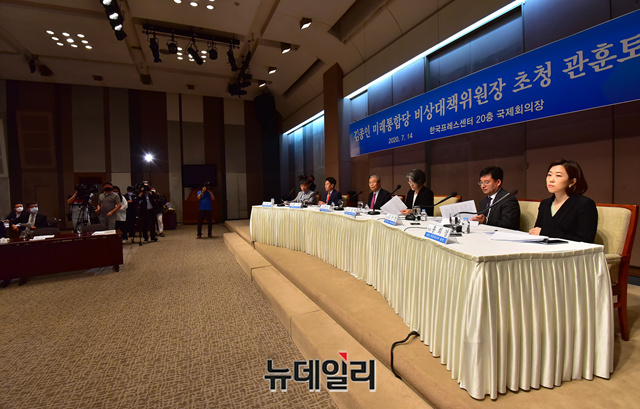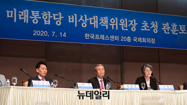 김종인 미래통합당 비상대책위원장이 14일 오전 서울 중구 한국프레스센터에서 관훈클럽 초청으로 열린 관훈토론회에서 참석자의 질의를 듣고 있다.
