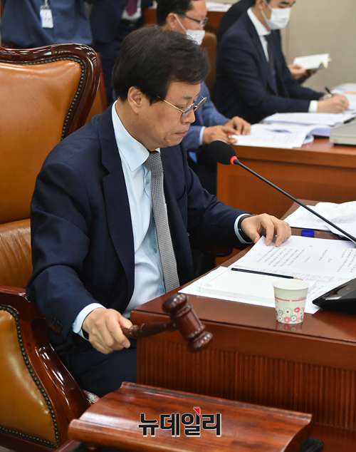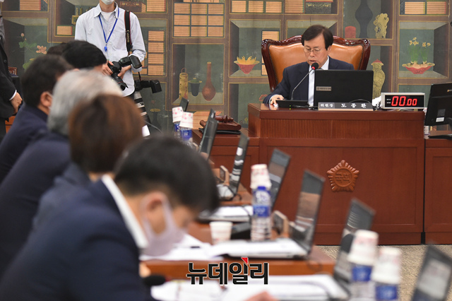도종환 문화체육관광위원회 위원장이 14일 오전 국회에서 열린 전체회의에서 의사진행을 하고 있다.