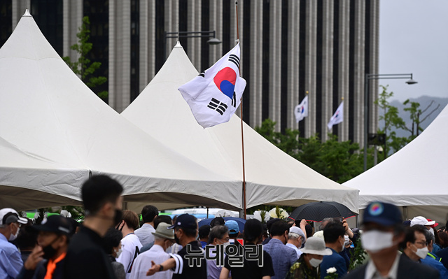 광화문에 설치된 백선엽 장군의 시민분향소에 14일 오후 조기가 내걸려 있다.