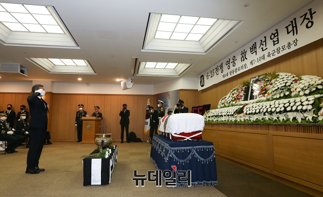 백 장군의 영결식은 서욱 육군참모총장 주관으로 15일 오전 7시 30분 서울아산병원에서 육군장으로 진행됐다. 장지는 국립대전현충원 제2장군묘역에 안장될 예정이다. (사진=공동취재단)