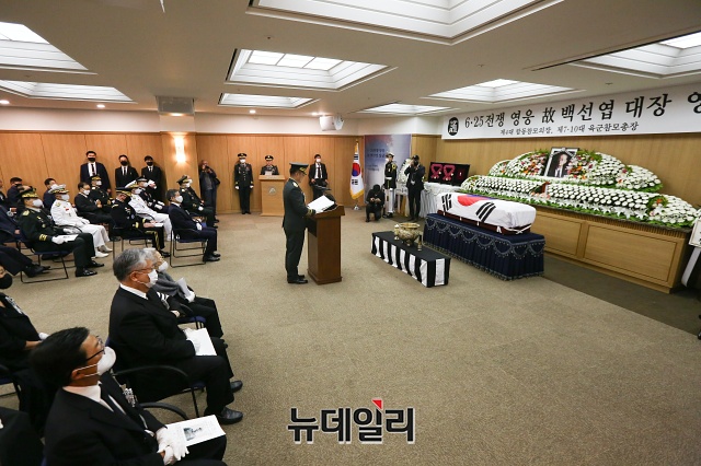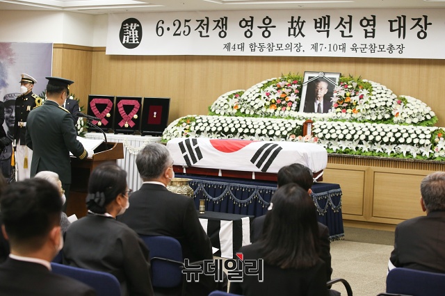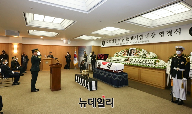 백 장군의 영결식은 서욱 육군참모총장 주관으로 15일 오전 7시 30분 서울아산병원에서 육군장으로 진행됐다. 장지는 국립대전현충원 제2장군묘역에 안장될 예정이다. (사진=공동취재단)