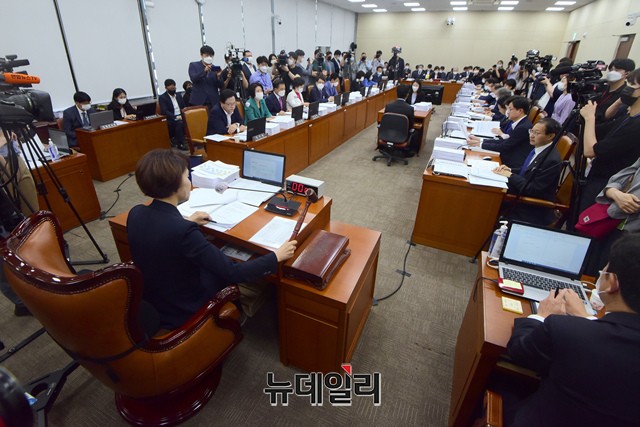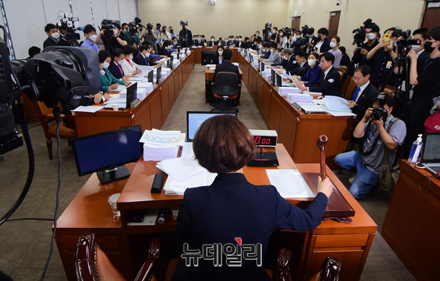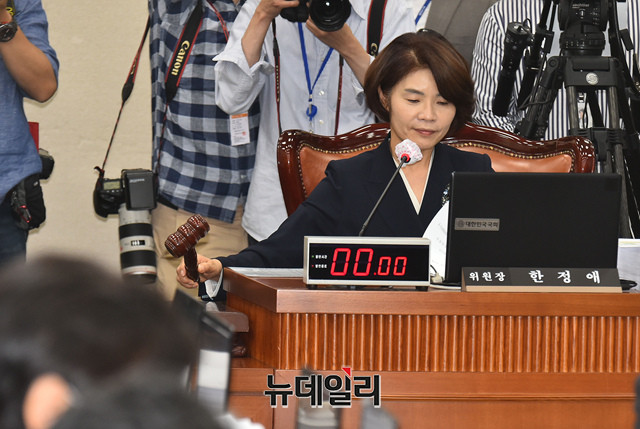 한정애 국회 보건복지위원장이 15일 오전 국회에서 열린 보건복지위원회 전체회의에서 의사진행을 하고 있다.