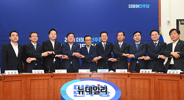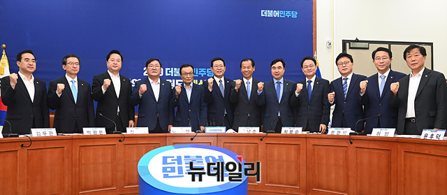 이해찬 더불어민주당 대표, 김태년 원내대표, 박남춘 인천시장, 최문순 강원도지사 등 참석자들이 15일 오전 국회에서 열린 '더불어민주당-인천·강원 예산정책협의회'에서 기념촬영을 하고 있다.