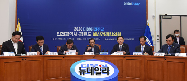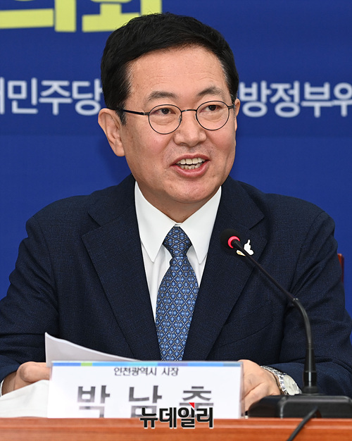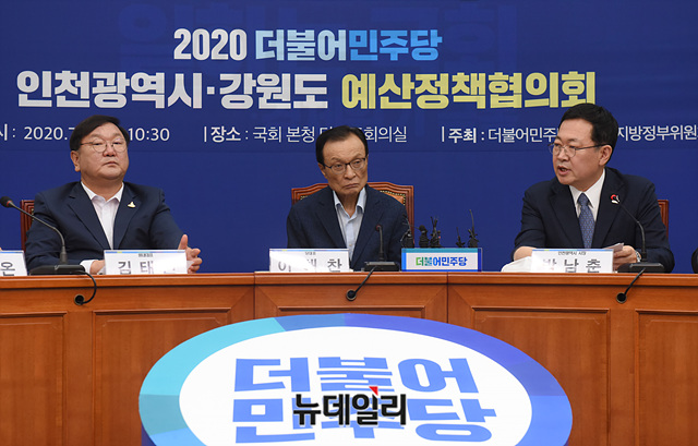 박남춘 인천시장이 15일 오전 국회에서 열린 '더불어민주당-인천·강원 예산정책협의회'에서 발언을 하고 있다.