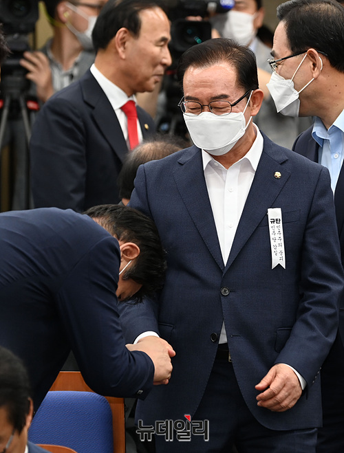 주호영 미래통합당 원내대표, 이종배 정책위의장, 김성원 원내수석부대표 등 지도부가 15일 오후 국회에서 열린 의원총회에 참석하고 있다.