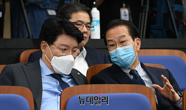 장제원 미래통합당 의원과 권영세 의원이 15일 오후 국회에서 열린 의원총회에 참석해 대화를 나누고 있다.