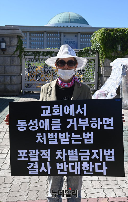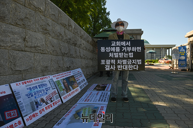 대한민국수호100만평신도연합 대표인 손 모씨가 15일 오후 국회 앞에서 '포괄적 차별금지법' 반대 1인 피켓시위를 하고 있다.손 대표는 "'포괄적 차별금지법'은 성 정체성 혼란·무차별 난민유입·김일성 주체사상 신봉자들에게 정당성을 주는 법"이라며 "국가보안법을 완전 무력화시키는 국가 전복법이 아닌가 의심하지 않을 수 없다"고 말했다.이어 "다른 국민들을 역차별하는 반 인권법으로 규정하고 '포괄적 차별금지법'을 저지하기 위해 전국민과 세계인권단체와 연대해 끝까지 투쟁하겠다"고 밝혔다.'포괄적 차별금지법'은 지난달 29일 장혜영 정의당 의원이 대표 발의한 법으로 성별, 성적 지향, 종교 등의 영역에서 합리적인 이유 없는 차별을 금지·예방하는 내용을 담고 있다.
