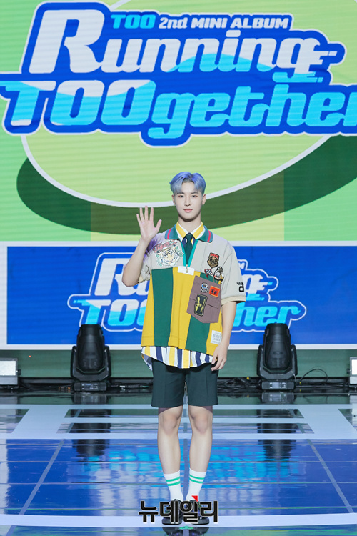 아이돌그룹 TOO(티오오) 멤버 경호가 15일 오후 온라인으로 진행된 2번째 미니앨범 'Running TOOgether(러닝 투게더)' 쇼케이스에서 포토타임을 갖고 있다.
