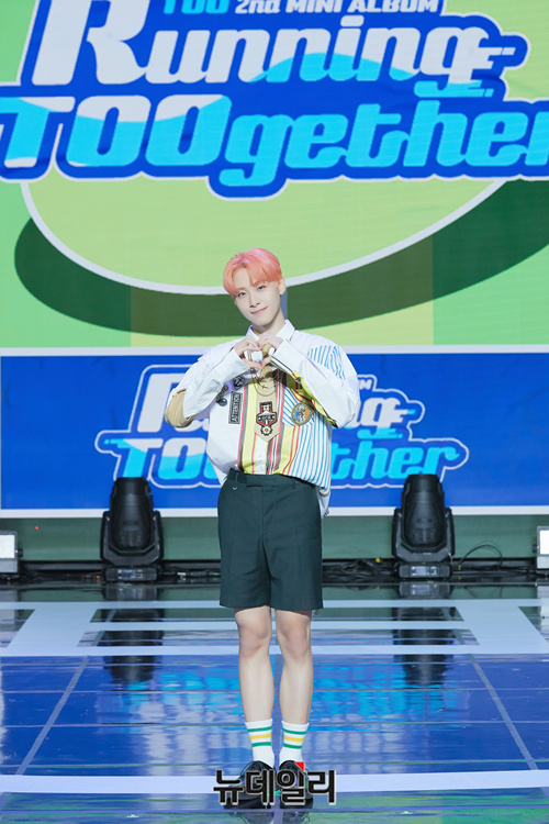 아이돌그룹 TOO(티오오) 멤버 제롬이 15일 오후 온라인으로 진행된 2번째 미니앨범 'Running TOOgether(러닝 투게더)' 쇼케이스에서 포토타임을 갖고 있다.