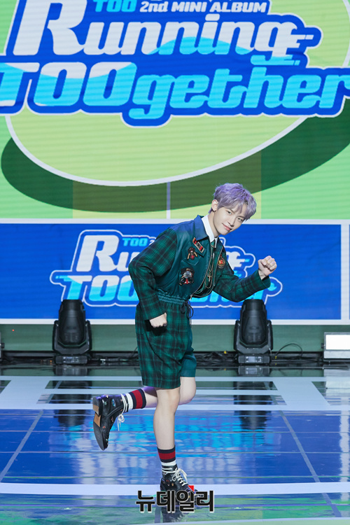 아이돌그룹 TOO(티오오) 멤버 찬이 15일 오후 온라인으로 진행된 2번째 미니앨범 'Running TOOgether(러닝 투게더)' 쇼케이스에서 포토타임을 갖고 있다.