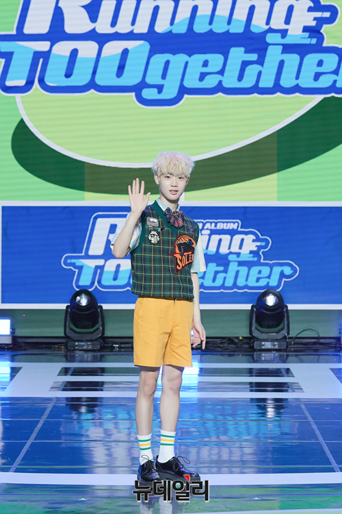 아이돌그룹 TOO(티오오) 멤버 치훈이 15일 오후 온라인으로 진행된 2번째 미니앨범 'Running TOOgether(러닝 투게더)' 쇼케이스에서 포토타임을 갖고 있다.