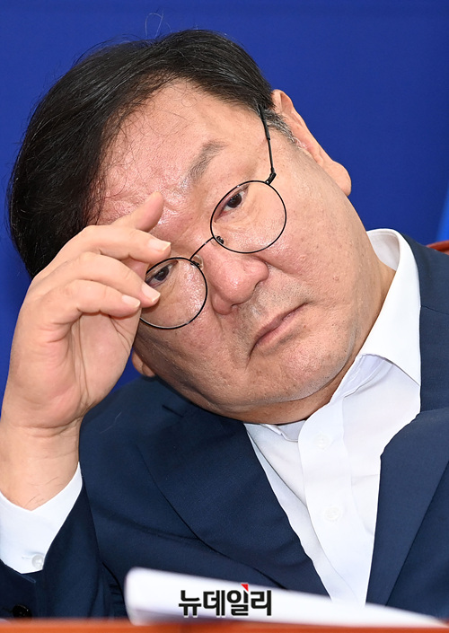 김태년 더불어민주당 원내대표가 16일 오전 국회에서 열린 제4차 중앙위원회의에 참석해 자리하고 있다.