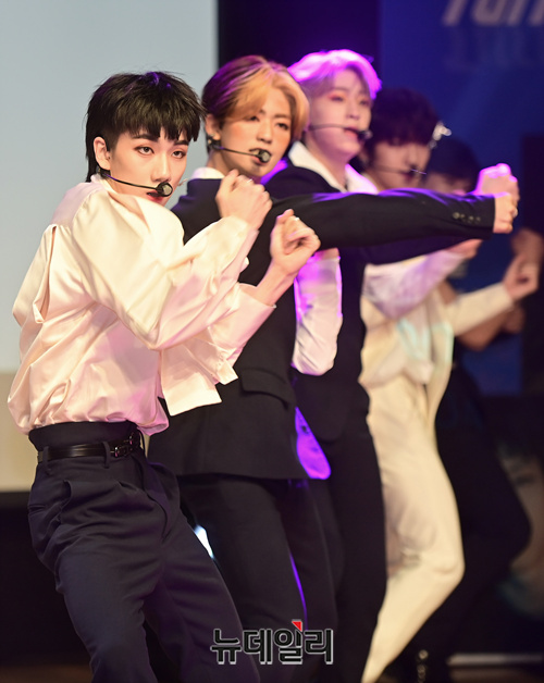 9인조 아이돌그룹 '원더나인(1THE9)'이 16일 오후 서울 강남구 일지아트홀에서 열린 3번째 미니앨범 'Turn Over(턴 오버)' 쇼케이스에서 타이틀곡 무대를 선보이고 있다.