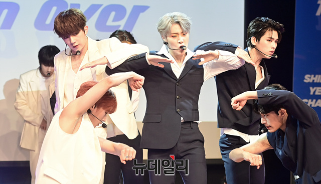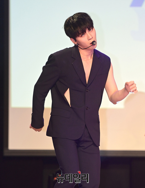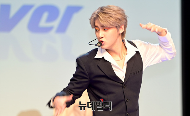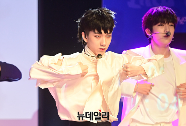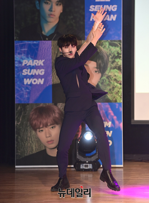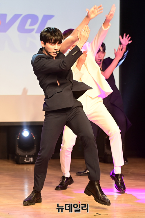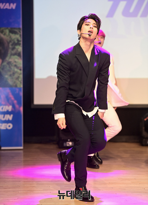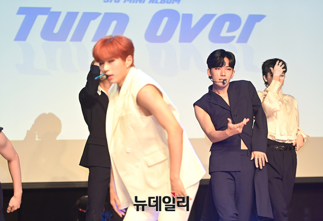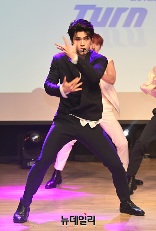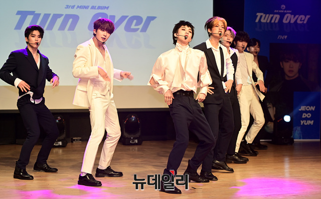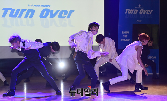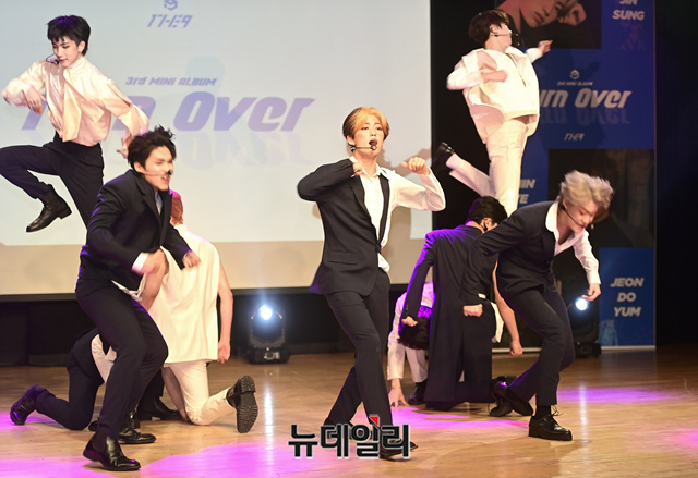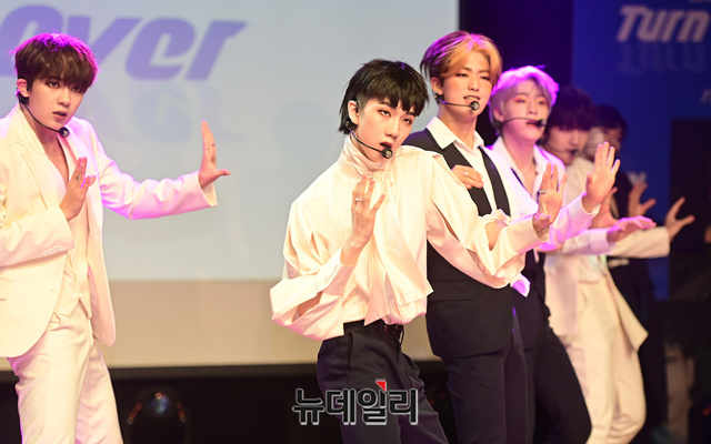 9인조 아이돌그룹 '원더나인(1THE9)'이 16일 오후 서울 강남구 일지아트홀에서 열린 3번째 미니앨범 'Turn Over(턴 오버)' 쇼케이스에서 타이틀곡 무대를 선보이고 있다.