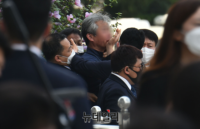 문재인 대통령이 16일 오후 국회에서 열린 21대 국회 개원식 연설을 마치고 떠나려 하자 한 남성이 신발을 집어던진 후 "가짜 인권 대통령 문재인을 물러가"며 규탄 구호를 외치고 있다.