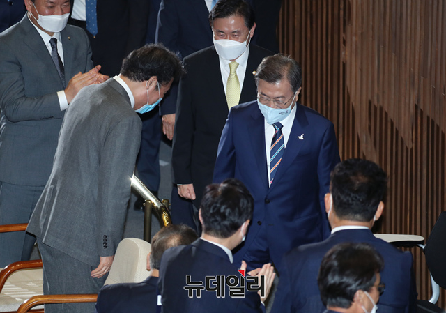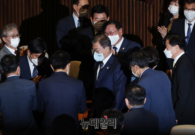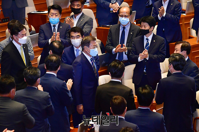 문재인 대통령이 16일 오후 국회 본회의장에서 열린 제21대 국회 개원식에 참석해 여당 의원들의 기립박수를 받으며 입장하고 있다.