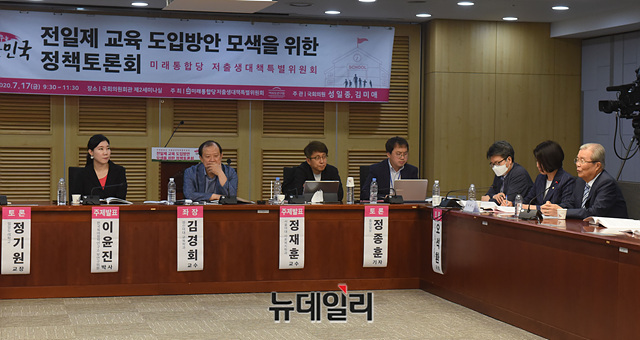 김종인 미래통합당 비상대책위원장이 17일 오전 국회 의원회관에서 열린 전일제 교육 도입방안 모색을 위한 정책토론회에 서 축사를 하고 있다.